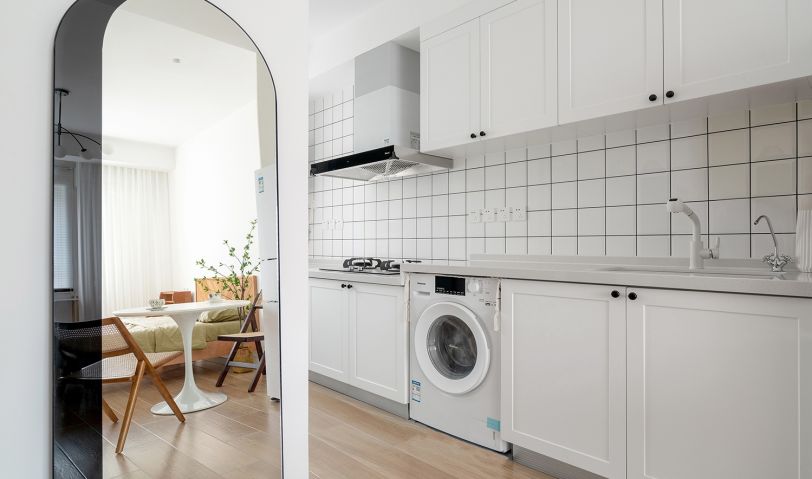 廚房做了高低臺,一方便把洗衣機(jī)內(nèi)嵌提高了使用性,另外也方便烹飪時(shí)的切配。地面木紋磚通鋪弱化了廚房空間,白色柜體與小白磚使廚房與其他區(qū)域更加融合。