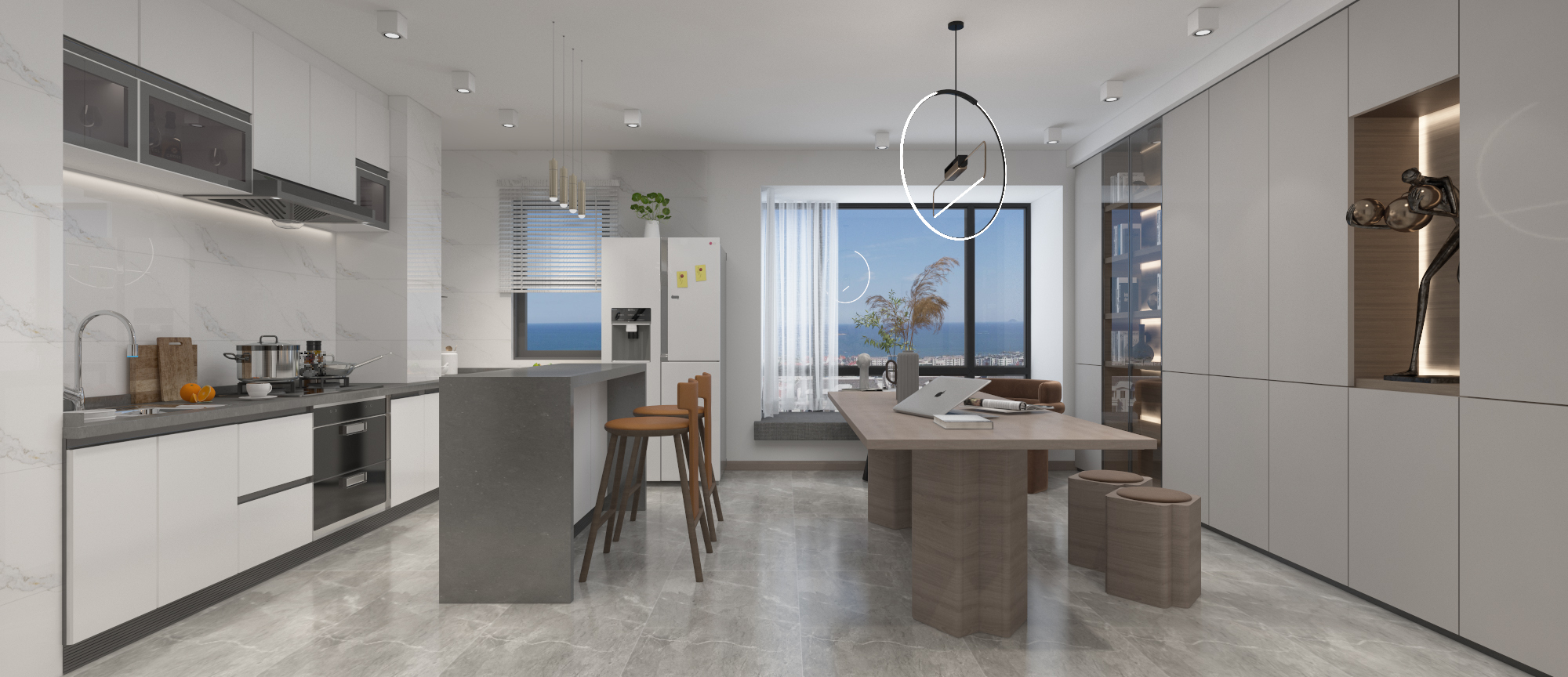 年輕夫妻居住,比較追求設計感和舒適度。摒棄了常規沙發客廳的效果,放了大桌子的效果,男女主人可以在長桌上辦公,也可以陪孩子一起做手工,增添了親子間的樂趣。