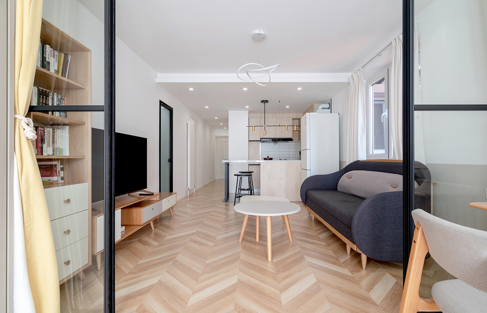 客廳選購可折疊的雙人布藝沙發床,臨時還能充當的居住空間。魚骨拼地板,給空間的帶來層次感,還有一種釋放延伸的效果。電視背景墻區域沒有做過多的裝飾,簡單的電視柜以及書柜組合,增加家居的靈活性,也方便后期挪動。