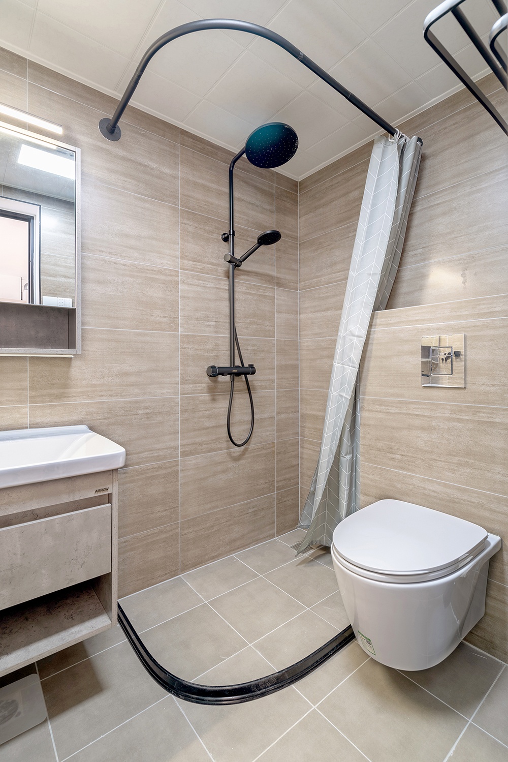 淋浴空間采用浴簾做遮擋的形式,讓使用方便,空間更加的靈活。壁掛馬桶懸空,方便地面的清潔工作。黑色的浴具,使衛生間凸顯現代感。