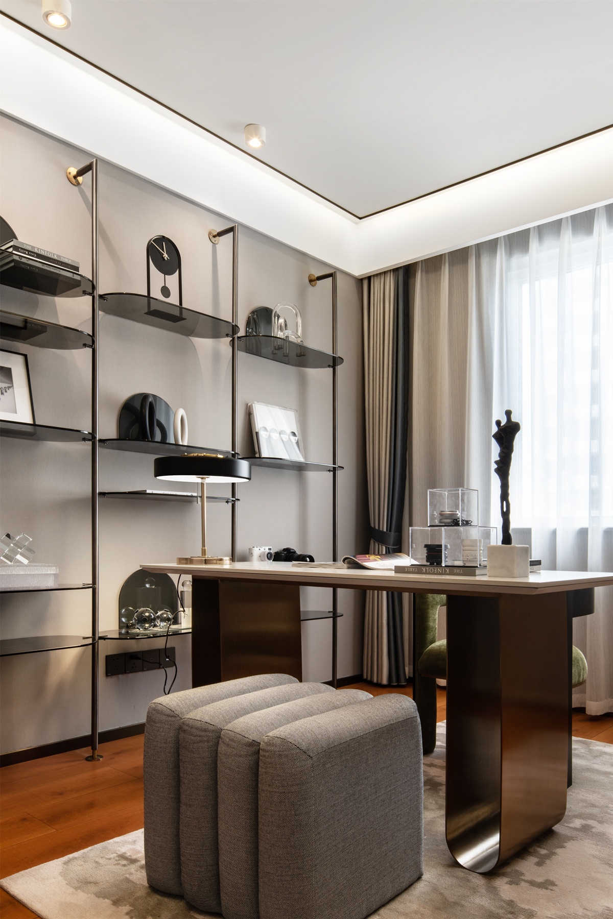 充滿格調的書房,靜謐嚴謹。墻壁的展臺,如藝術品般相依而列,優雅又迷人。