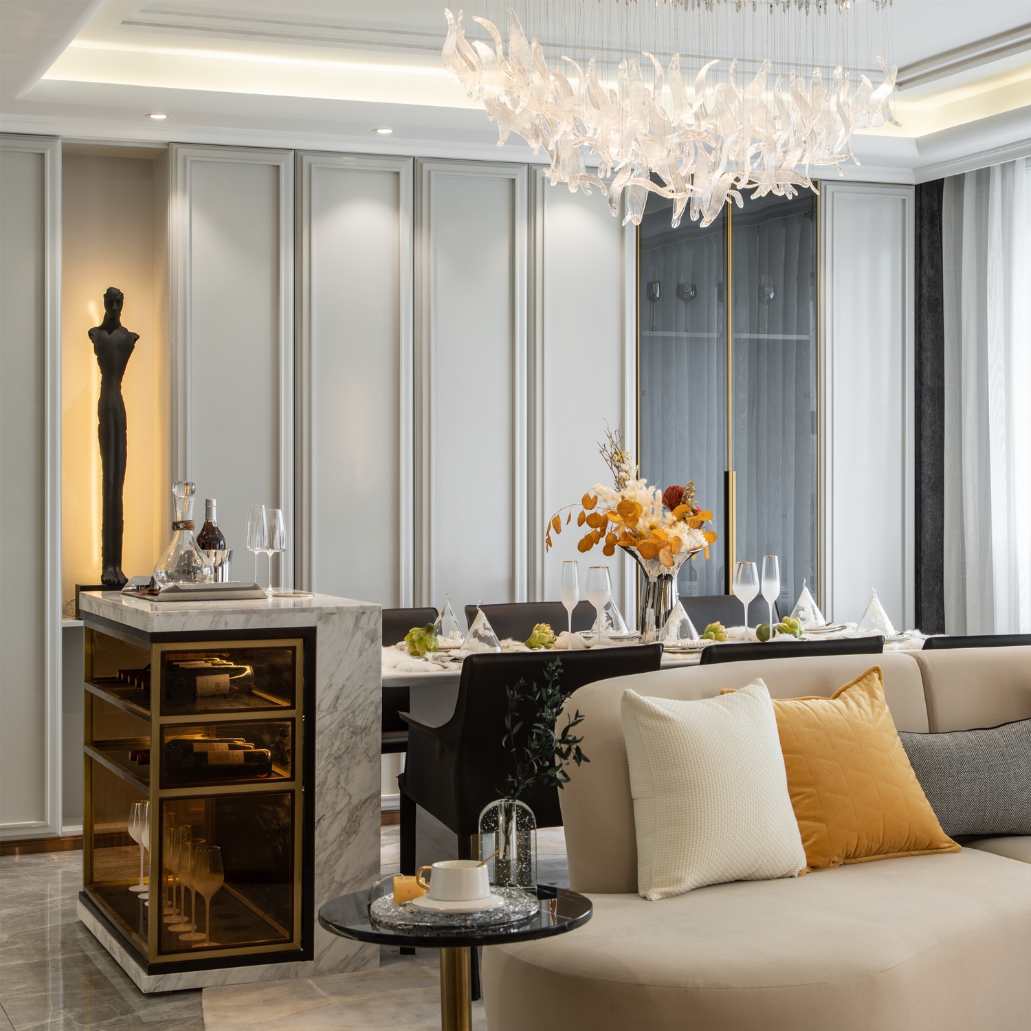 明黃色的點綴,為華麗的客廳空間多了份熱情;由遠及近的視覺層次感,為偌大的客廳增添了一份舒適的秩序之美。若隱若現的石膏線,充分展現出法式的高級感。