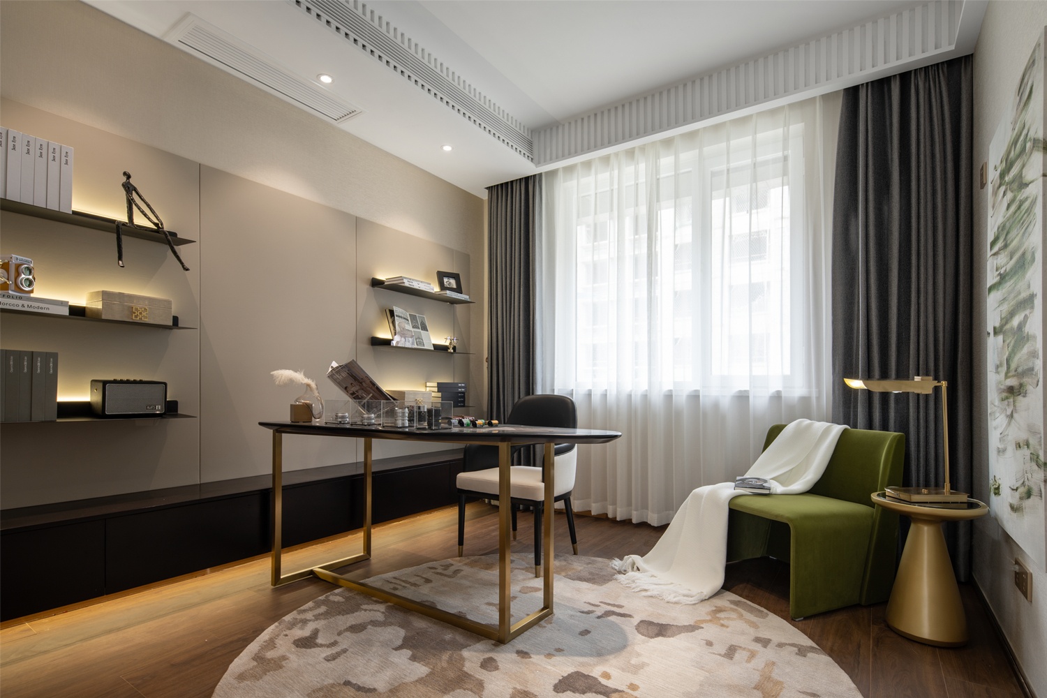 書房采用靜雅的暗綠色系,簡潔的書桌、齊整的書架,營造出一份嚴密而又穩重的書香氣韻。