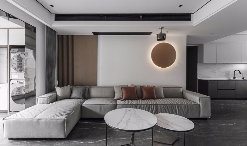 客廳采用無主燈照明見光不見燈的設計是對于人最舒適的顧及黑白的主色是干凈純粹的色調沒有過多的裝飾只是將木色和灰色穿插在空間中