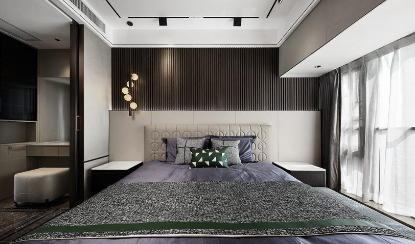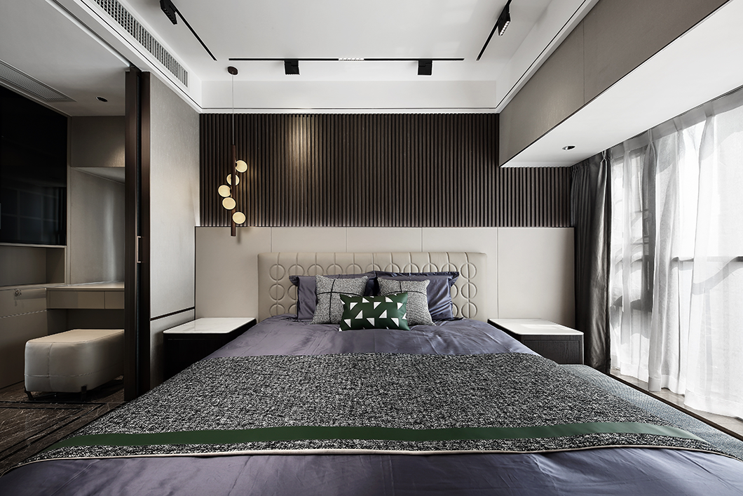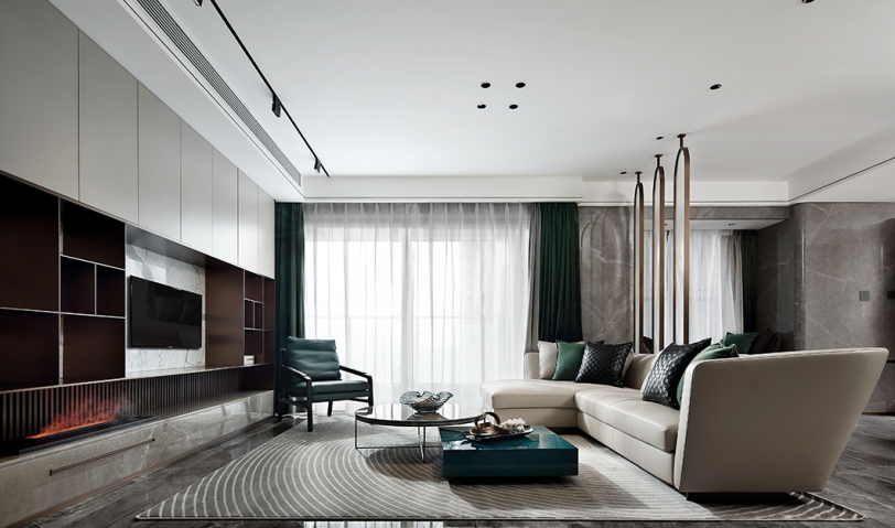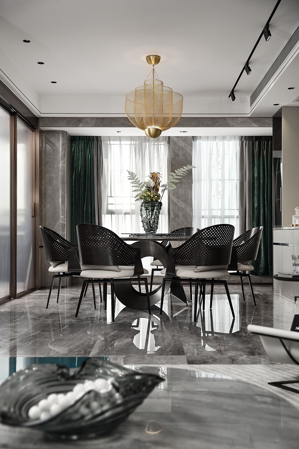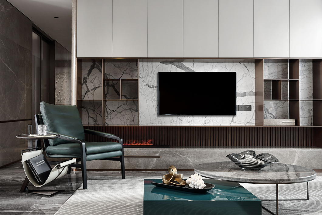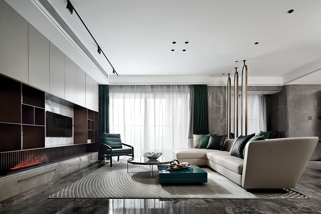 客廳茶幾與單椅創(chuàng)新地運(yùn)用了帶有底紋的墨綠色,沉靜內(nèi)斂又不失新意。同時(shí),沙發(fā)與茶幾均保持了較低的水平面,不僅令空間顯得大氣,也讓主人的生活狀態(tài)更趨舒適和休閑,或坐或臥或躺,都散發(fā)著寧靜的自由感。