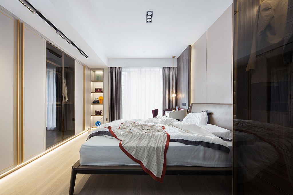 陽光透過紗簾灑進(jìn)臥室,淺灰色木地板散發(fā)著溫馨自然的味道。床頭背景是素雅的灰色硬包+煙熏橡木護(hù)墻板的形式,鑲嵌不銹鋼條做功能分區(qū),床頭搭配金屬吊燈,頓時讓空間變得優(yōu)雅溫馨。