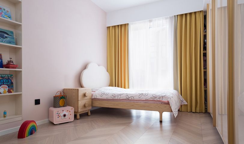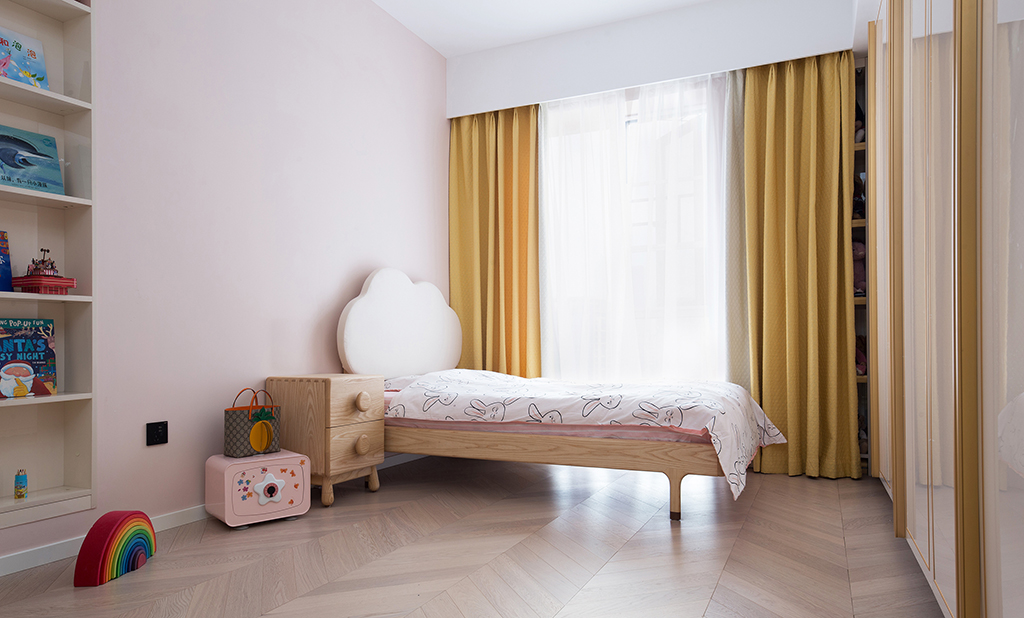 兒童房將收納空間做得比較充足,玩具和圖書都有自己的專屬位置,就連與窗戶轉(zhuǎn)角的凹位處也做了一個玩具展示柜。留出地面空間讓孩子自由玩耍。