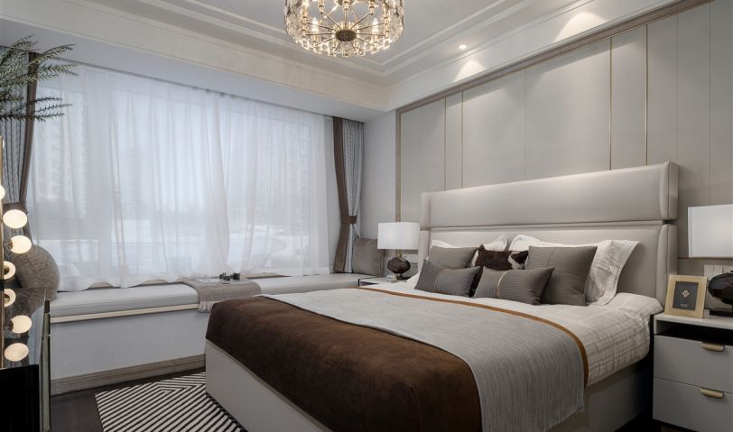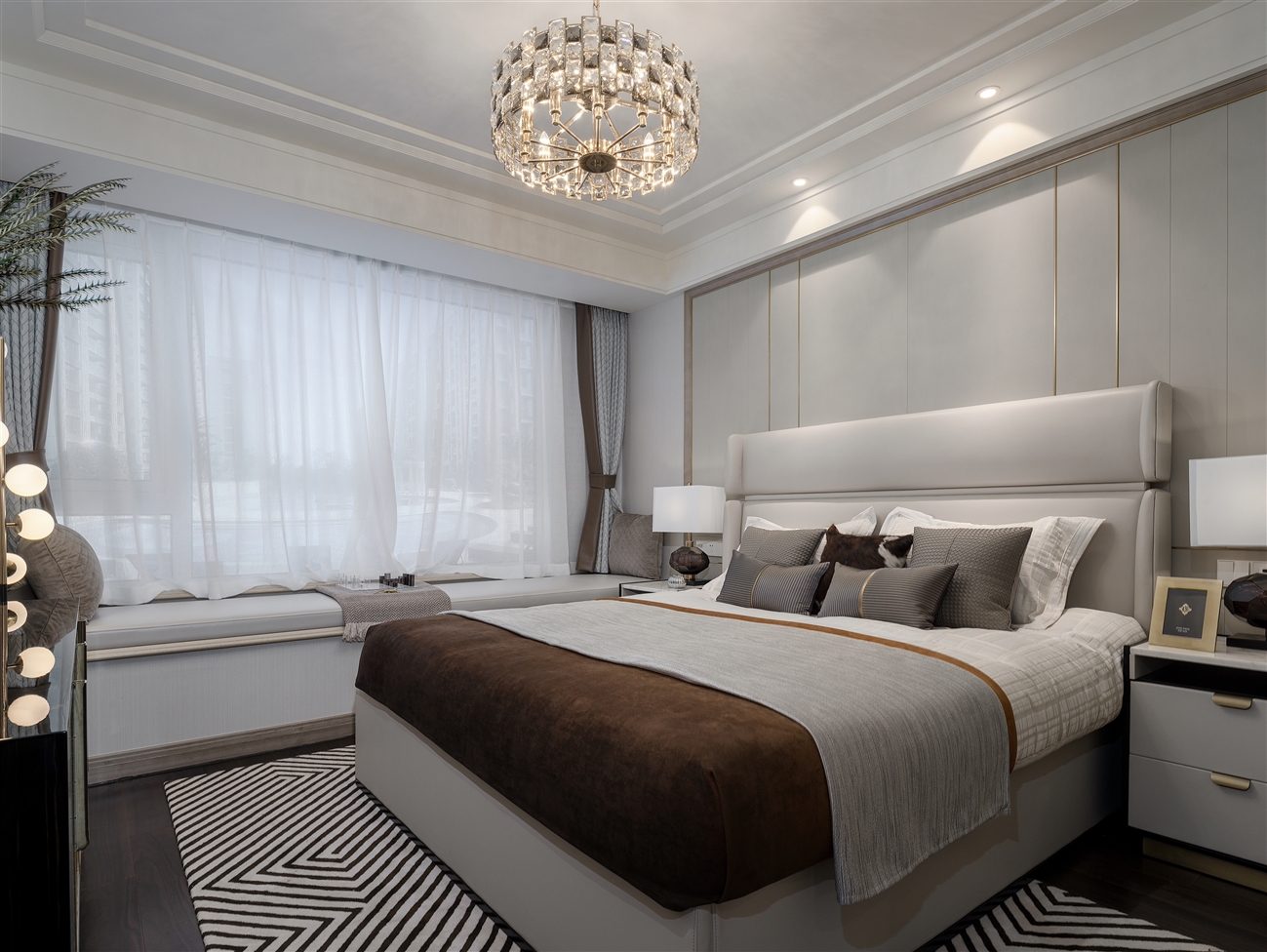 主臥以休息為主,故在主色調的基礎上調和了比例,循序漸進地渲染出一個平和又不失高貴的意式風格。帶有棱角韻味的皮質家具,不動聲色地為空間賦予可感知的生活態度,個性飾品的擺放又映射出主人頗有藝術感的內心。將家主性格與家具擺設建立起一種和諧的精神秩序。