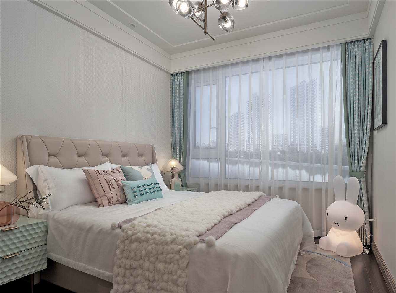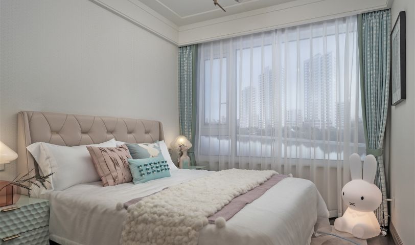 女兒房色彩相對鮮明,但又不過分跳躍,均由原有的基調柔和過渡而成,打造一個溫柔又不失生命力的空間,像是擺件中童話里走出來的少女,在大自然的包裹中,恬靜而鮮活。
