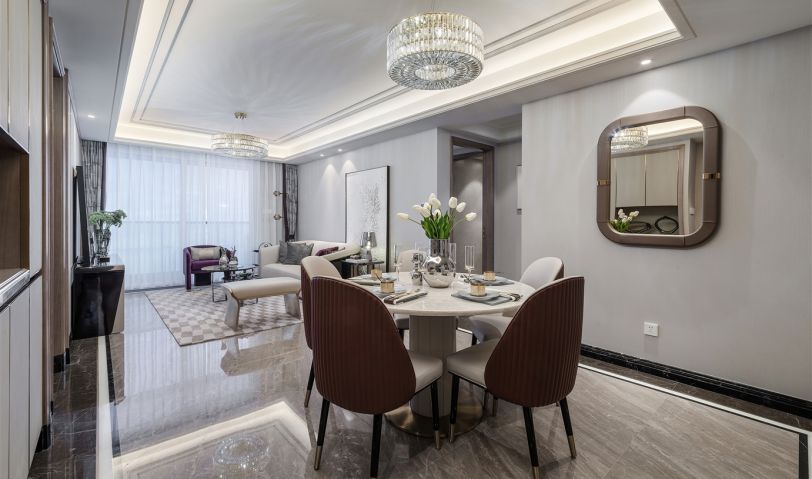 餐廳延續客廳的基調,在細節上,通過大理石餐桌和皮革包裹的搭配,以及金屬色邊框的墻面鏡,讓輕奢的氣息滲透到質感內。銀色花瓶內的郁金香,與金色餐飾內的一抹綠意,恰到好處的點綴了空間的沉穩,多了一份春意。