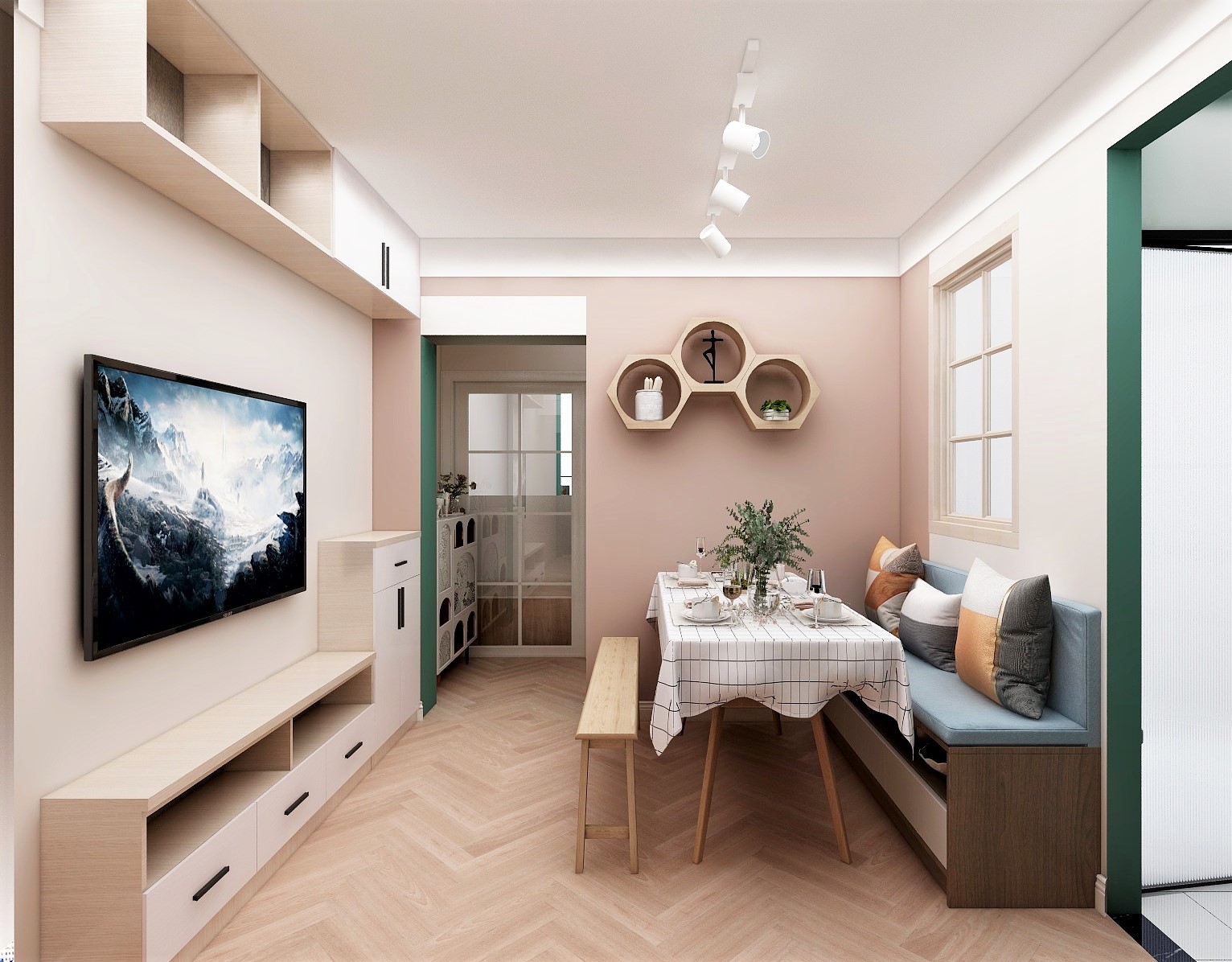 客餐廳使用沙發卡座和多功能餐桌實現客餐廳一體的功能