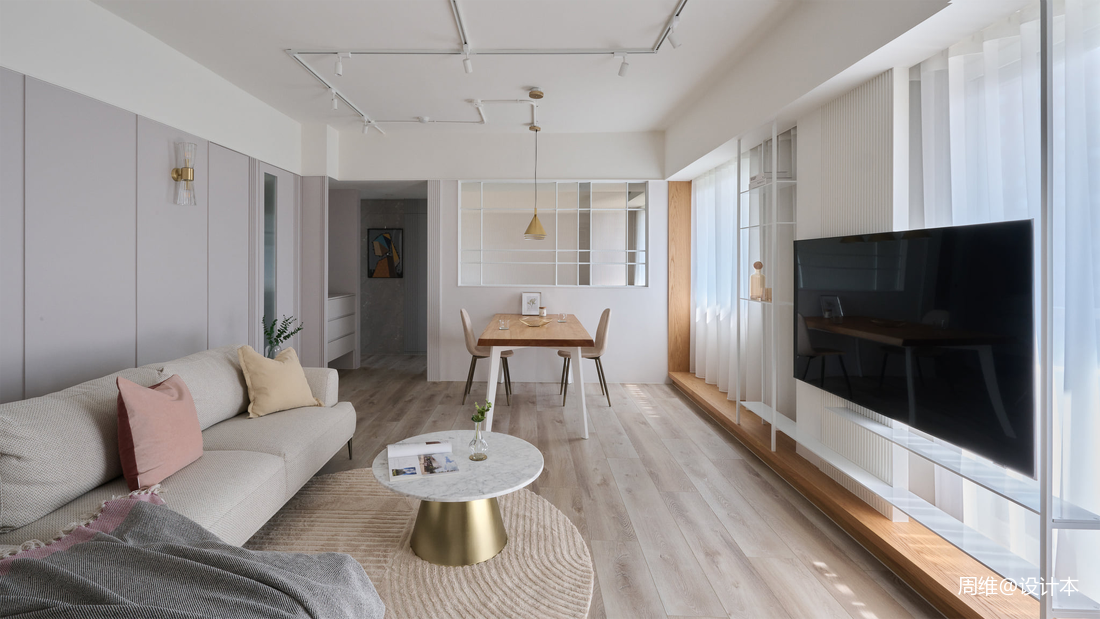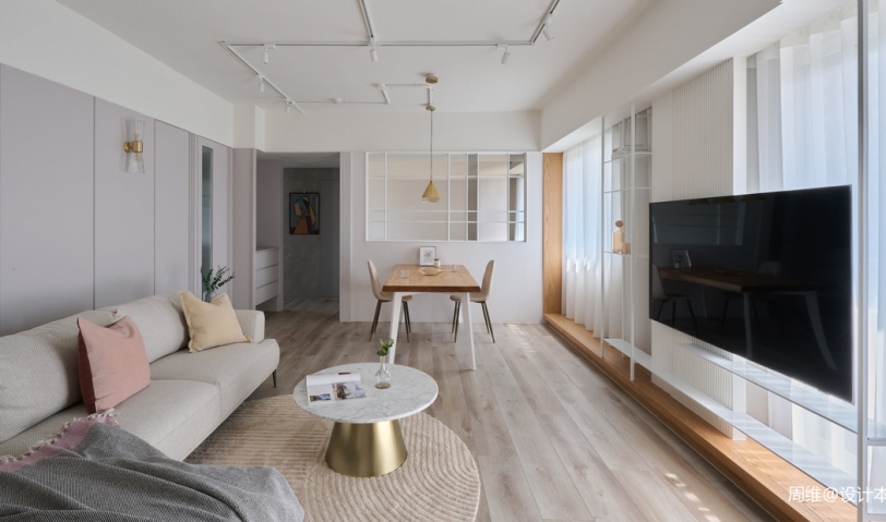 沙發背景墻隱藏廚房臥室,一體化的背景墻營造視覺的統一感。沙發右側收納層板和整排的抽屜滿足了收納的需求,柜子上面可以擺放裝飾品和綠植的搭配,讓功能與美感達到一個平衡。
