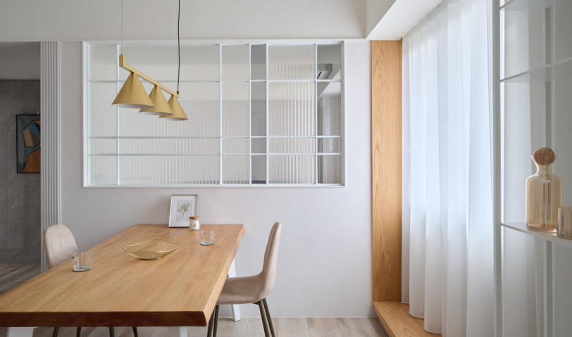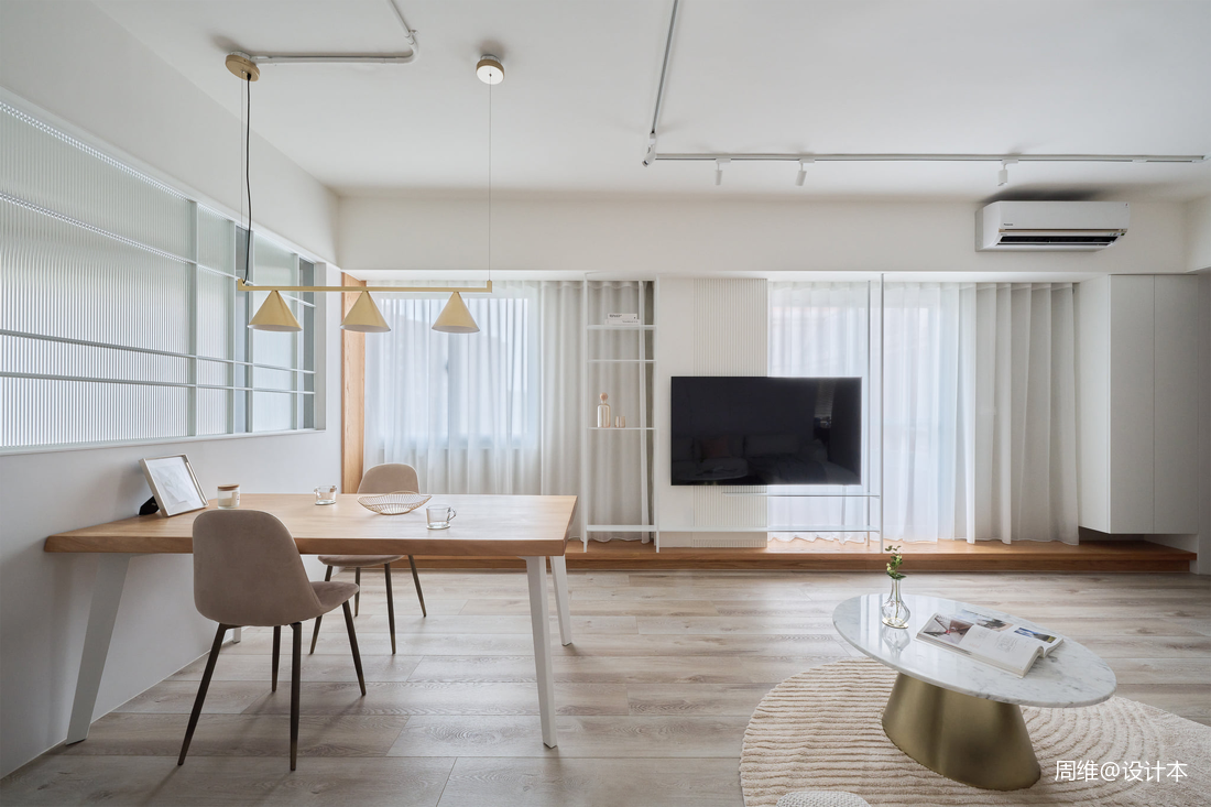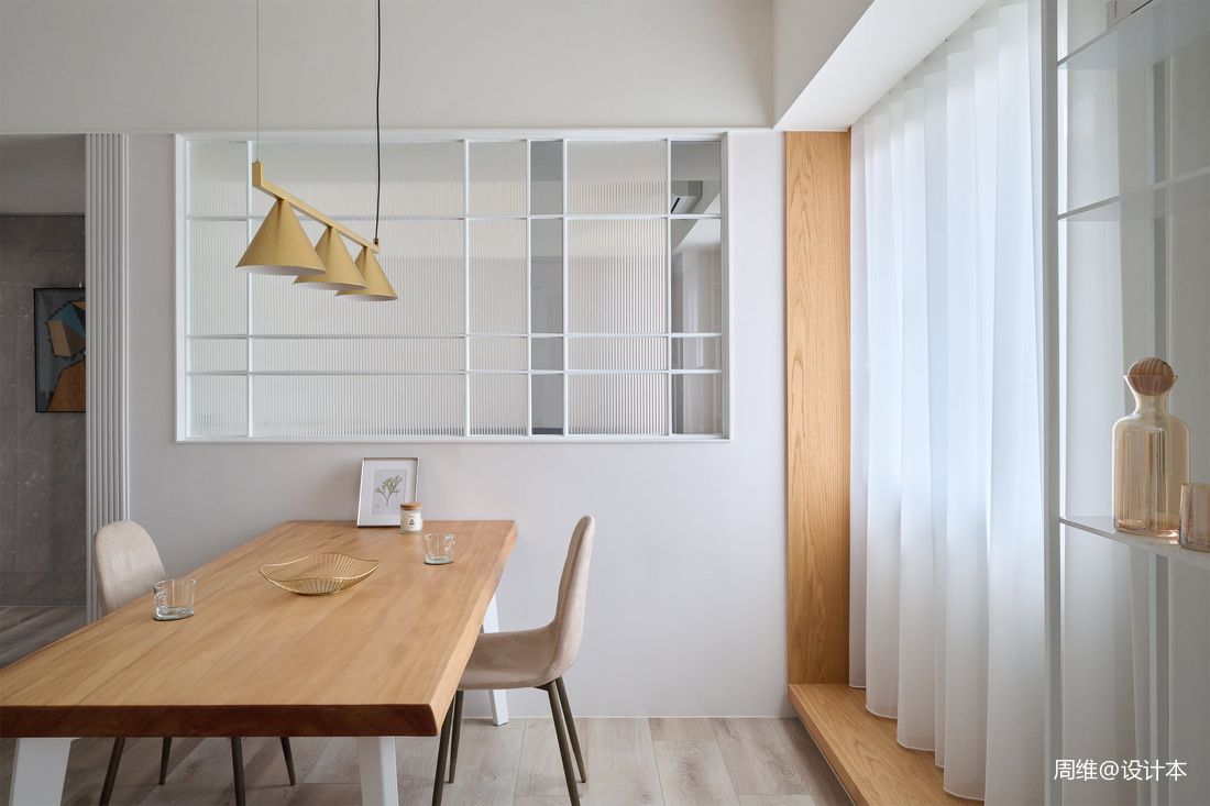 在餐廳這面墻,增加長虹玻璃營造精致感黃銅質感的吊燈,就餐區搭配原木色的餐桌,復古又溫馨,