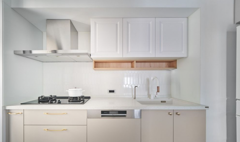 白色、香檳金的廚房配色加入黃銅色的拉手,給人干凈、舒適的視覺感受。臺下盆的設計更便于小臺面的使用。廚房雖小,日常的柴米油鹽都潛藏在這片小天地,烹飪餐食,談笑間將溫馨氛圍營造。