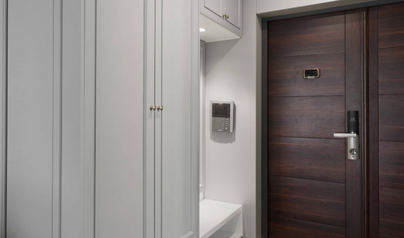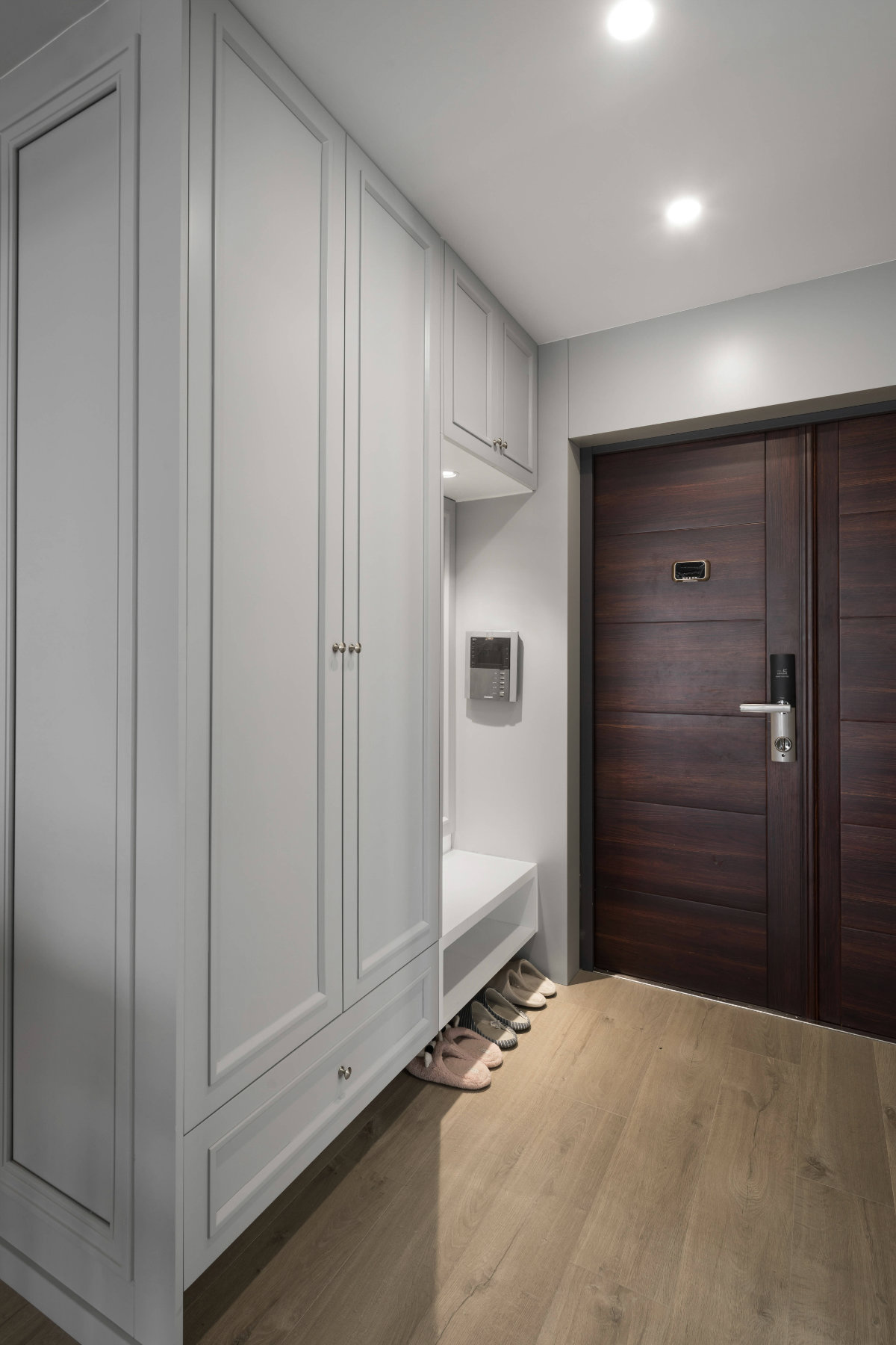 玄關柜中部留空嵌入光源,可作換鞋凳,底部懸空便于收納常用拖鞋。