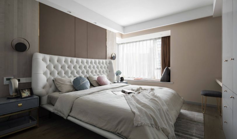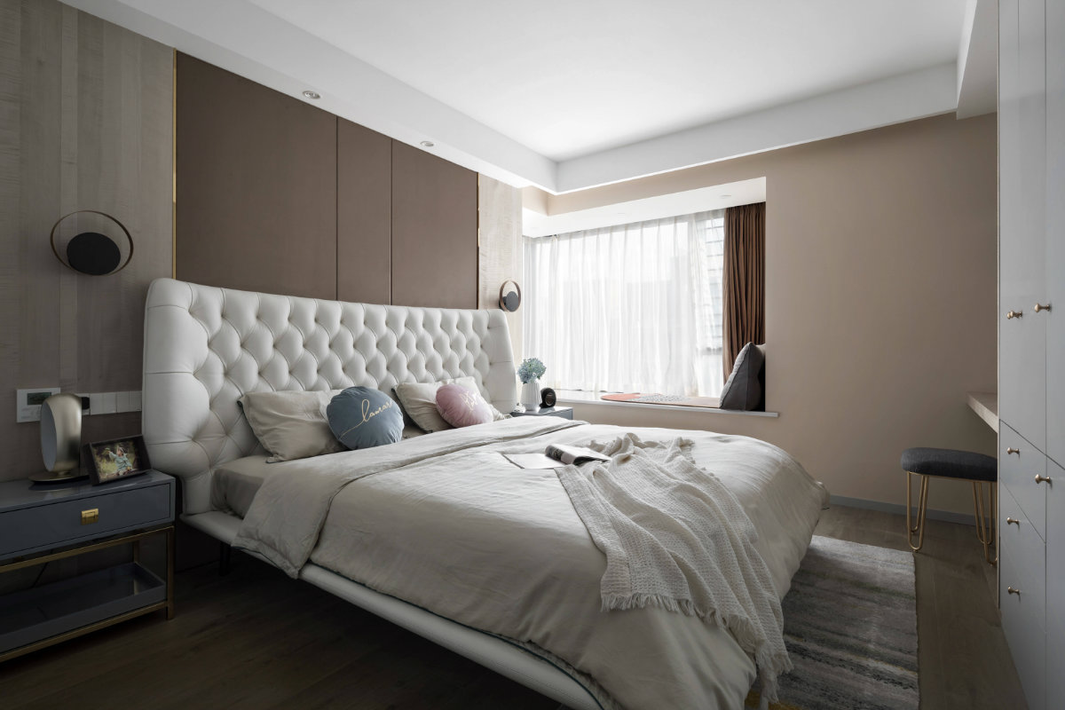 米白色的皮質床靠在咖色的軟包床頭墻上,