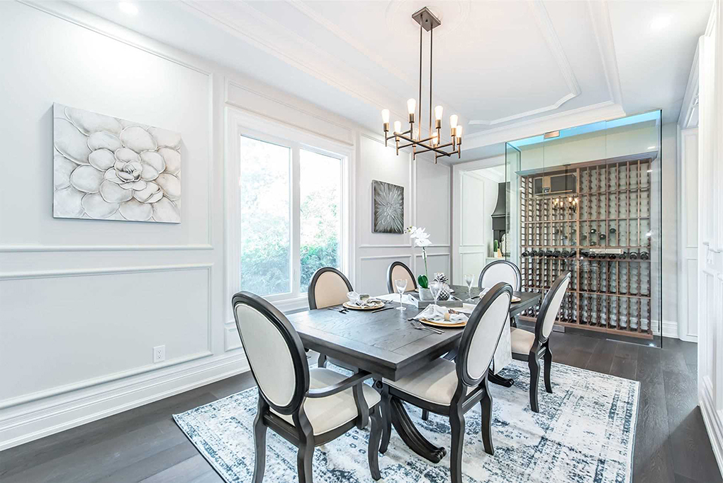 餐桌一旁的大窗戶保證了餐廳充足的采光,純白色的墻壁加木地板形成明顯的對比,更顯白色墻面的純凈素雅,回型的石膏線吊頂極具對稱美感,金色的吊燈和餐桌一旁的酒架也在彰顯著房間的格調和屋主的品味。
