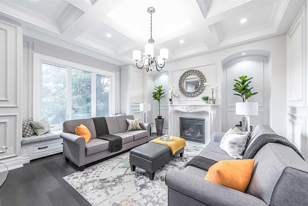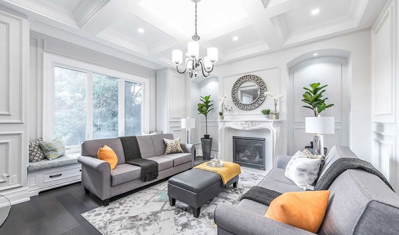 客廳的色調以白色+灰色為主,墻壁、飄窗柜和吊頂都有石膏線作為裝飾,極具歐式的復古格調。和大部分以電視背景墻和電視機為中心的客廳設計不同,設計師在客廳中設置了壁爐,在為整個空間帶來強烈的歐式風格之外,其取暖功能也是非常實用的。