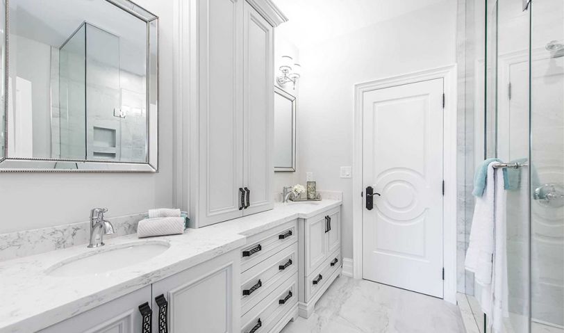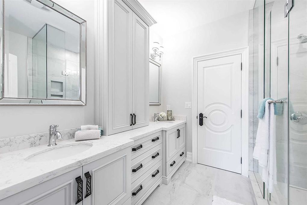 衛生間具有很強的功能屬性,如何將歐式風格的復古和華麗帶到這一空間是一個難題。設計師使用了黑白配色的歐式櫥柜,在滿足衛生間的儲物功能之外,也為衛生間增加了些許的歐式元素。