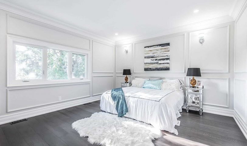 采用了無主燈的設計,整個房間的平面吊頂顯得規整,床頭背景墻上的兩個壁燈給臥室帶來視覺上的層次感和溫馨。