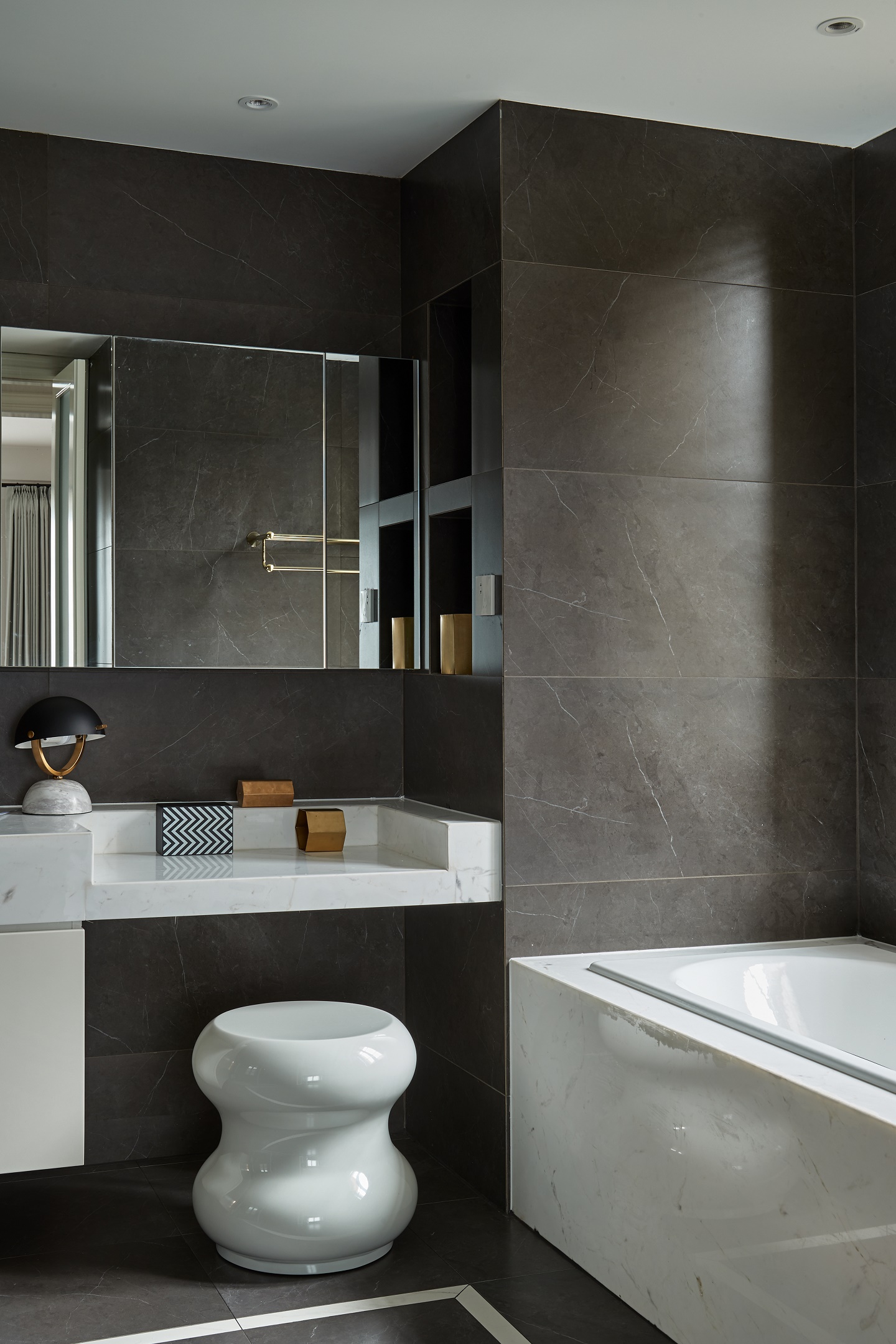 充分利用采光優勢,大量的自然光線穿透玻璃門窗直達室內,文藝的方磚搭配淺灰的墻漆,簡潔的浴缸,帶來放松與愜意。