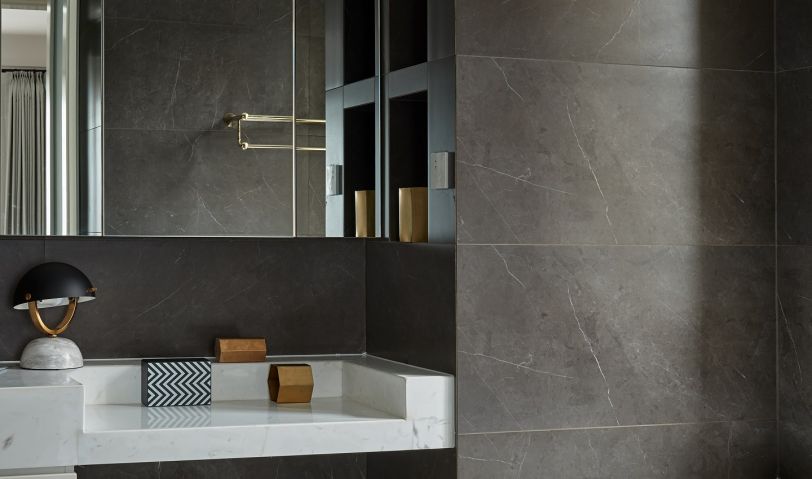 客廳是一個非常開放互動的公共空間,光線可以穿透進室內的每一角落,看似隨性家具擺放,更易于營造出藝術館的流通感,我們將整體的色彩簡化,以黑、白、灰三色作為基底,并以各種姿態展現(例如斑馬紋、菱形),大膽的靛色成為了最搶眼的點綴,從而達到色彩繁與簡之間的平衡,再搭配金屬飾品、素色裝飾畫,以及簡約的藝術品,拼湊出現代、舒適、愜意的放松空間。