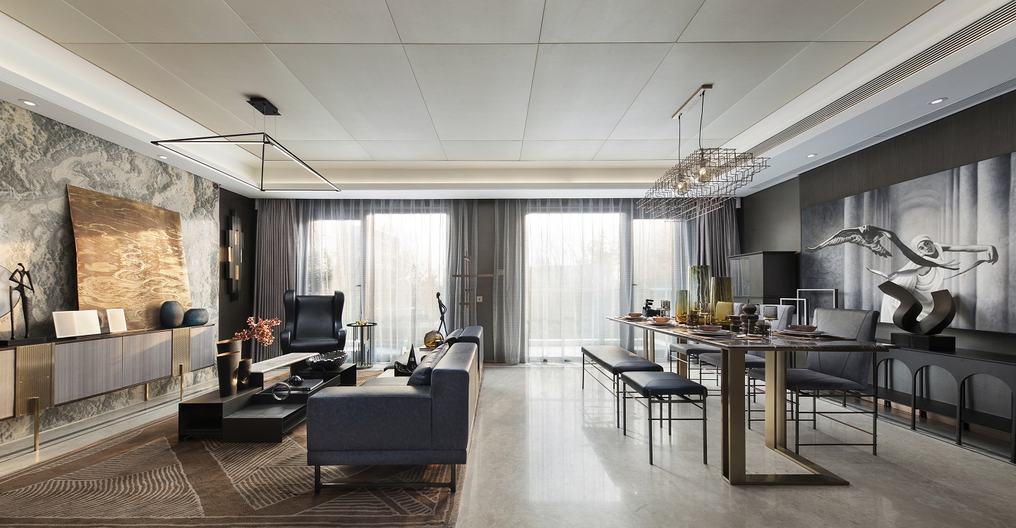 客廳與餐廳相連,自然光由通透的玻璃窗鋪灑進來,為居室附上一層溫馨恬靜的光暈。后現代的藝術裝置與背景的裝飾畫互相呼應,幾何形制的家具,低調中彰顯著現代精英氣質。