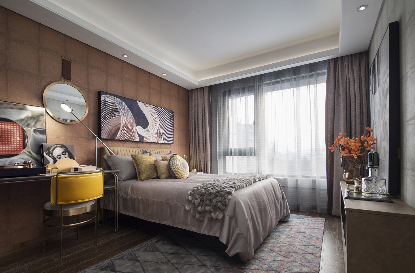 主臥設計體現了優雅的藝術品位,整體空間層次豐富且有序,具象和抽象的交織扭結,碰撞出嶄新的空間想象,在嚴謹理性中涂抹上輕松瀟逸的一筆。