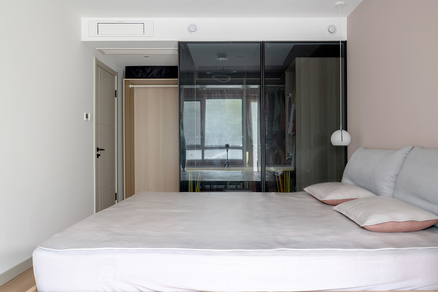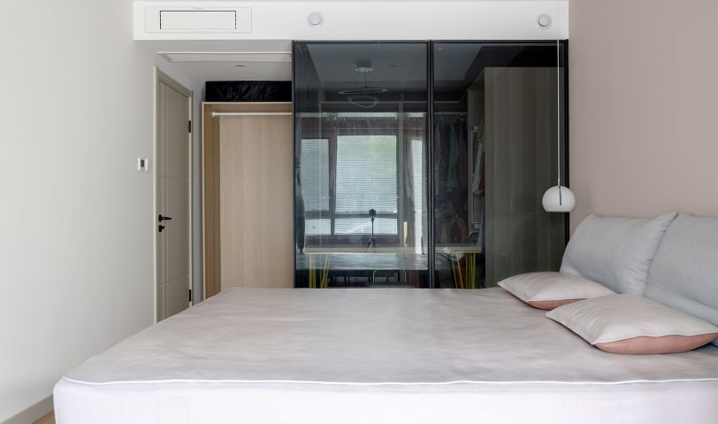 主臥進門處看,空間也是比較通透的,絲毫沒有因為深色玻璃,帶來的壓抑感。背景墻刷了暖灰色漆,再配合原木和灰色亞麻布藝,暖到心里了。