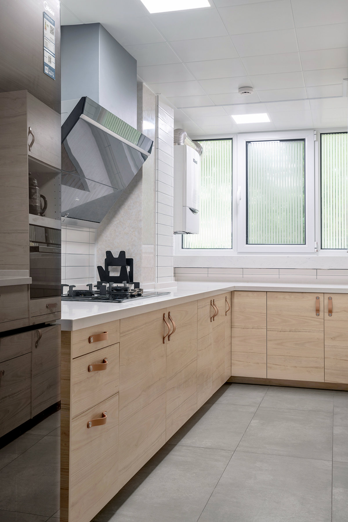 小白磚和木柜門搭配出來顏值是很高的,清新還顯得干凈。可能大家也都注意到了,每個空間的窗戶玻璃上都呈條紋。因為這個是一層,所以小區過往的人可能會隨時看到家里的樣貌,這種情況會讓私密性就比較差。因此屋主就自己在某寶購買了這個透明條紋貼紙,即便白天不用拉窗簾,也不會擔心采光。