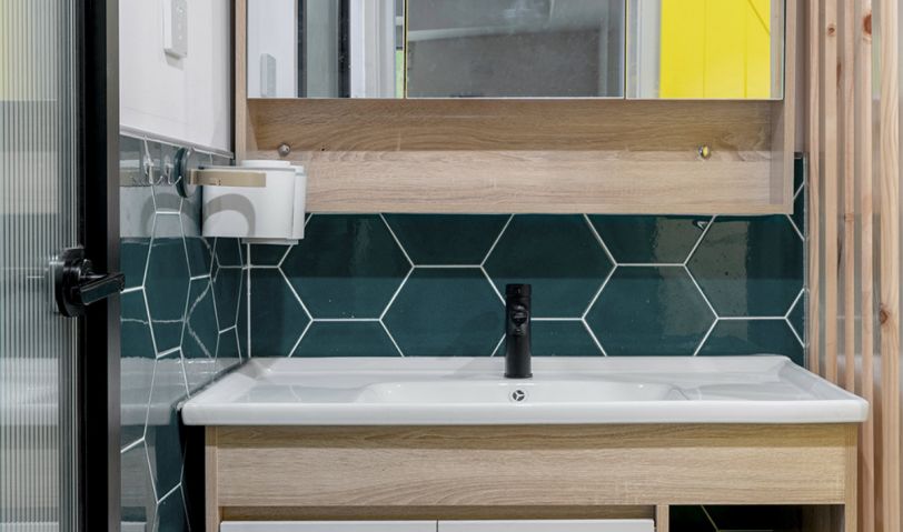 洗漱區放到了外面,這樣衛生間里外的功能,可以同時使用。側面安裝了屏風,這樣就不會進門一眼看到手盆,保持了進門玄關的美觀和完整性。用墨綠六角形瓷磚做點綴,高度上則是只貼到了半墻。其實像這樣的空間瓷磚不用貼通太高,可以只貼鏡柜后面,或者3面。上部可以刷防水漆進行拼接裝飾,裝飾彈性和選擇性都很大,完全可以根據自己的喜好來設計這個角落。衛生間加入了不小的按摩浴缸,特意在千挑萬選中找了這款扇形的,這樣可以保證里面空間的動線流暢。地面鋪設地磚的時候,特意做了凹凸紋理和防滑處理。防腐木安裝在淋浴房區域,與外面的地磚正好平齊,光腳踩在里面也不會涼。