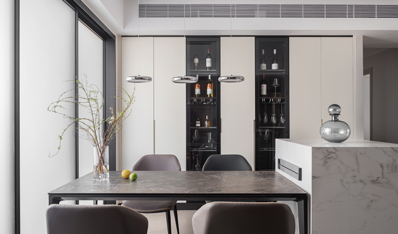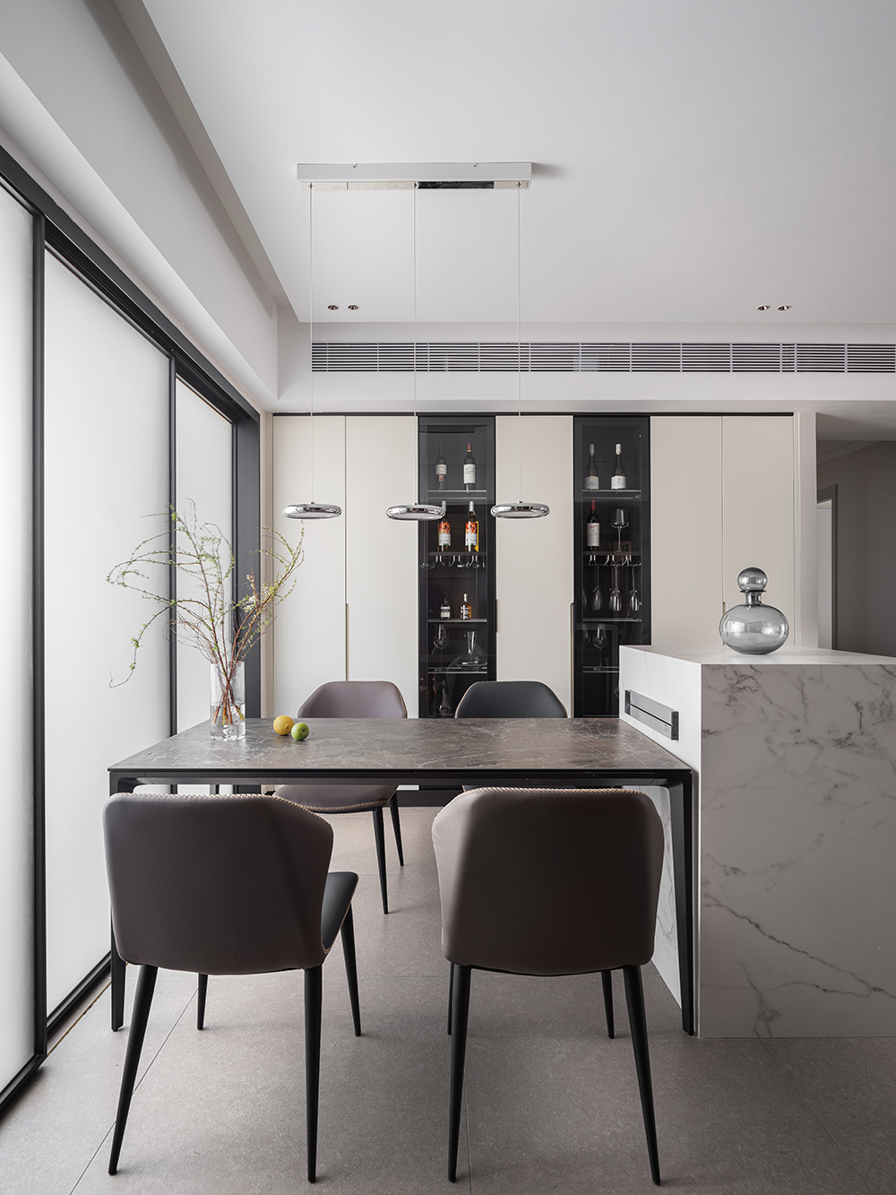 餐廳,是游刃有余穿梭光怪陸離后的港灣,石板餐桌、咖色座椅、極具藝術感的吊燈融匯在整個餐廳設計中