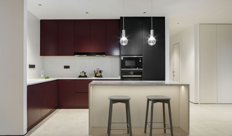 打通墻體后,廚房和客餐廳多了連接,更顯通透。大件家電則選擇“隱身”,空間姿態更輕薄簡約、收納力足夠,同時延續著瑪薩拉酒紅和風暴綠的撞色氣質。