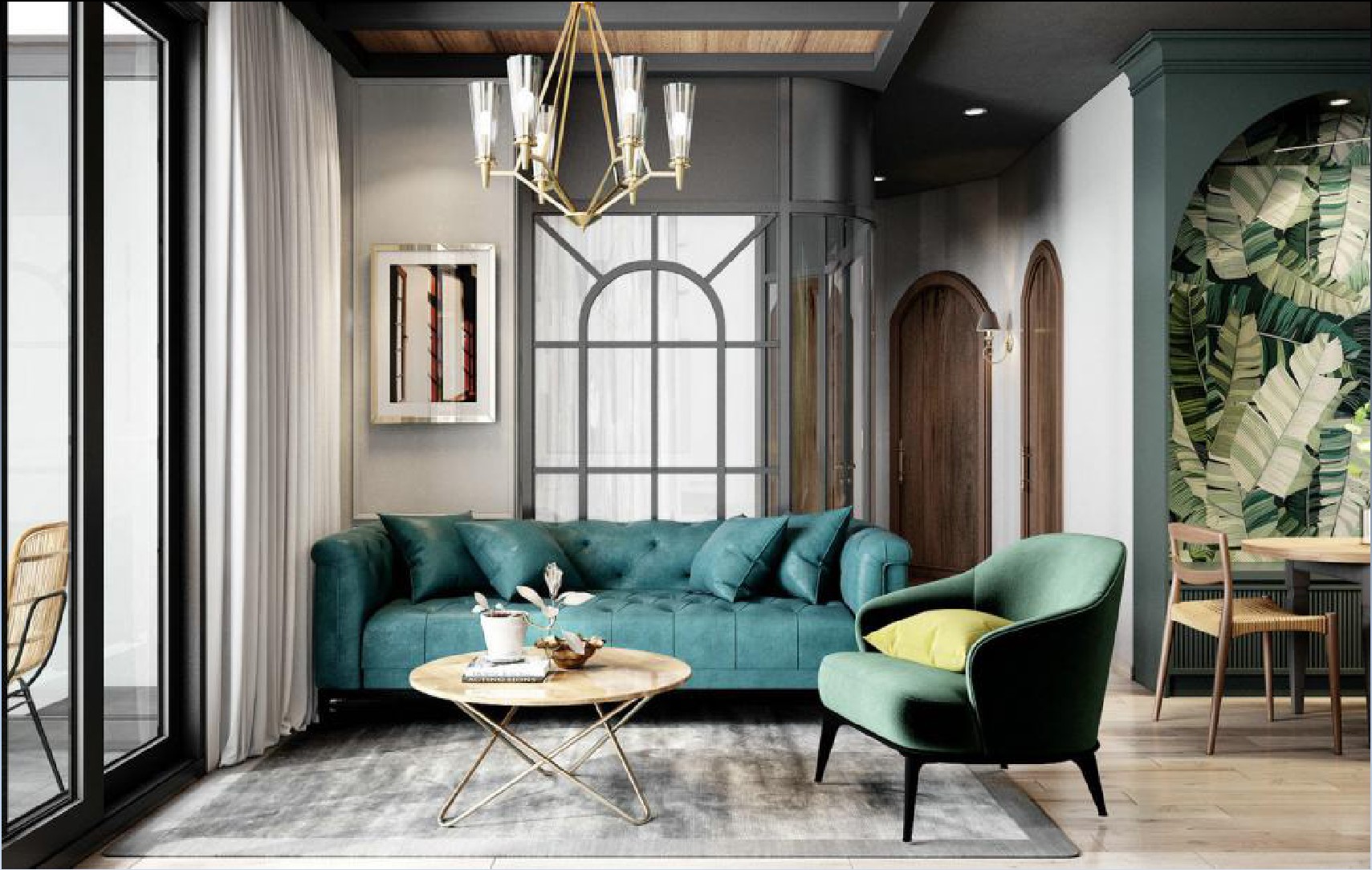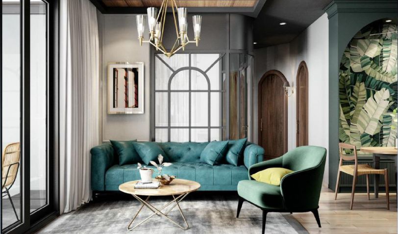 在客廳色調(diào)的選擇上,以高貴的墨綠色為主。運(yùn)用黃色的抱枕作為跳色,通過(guò)原木色地板搭配灰色地毯與藝術(shù)品的懸掛和燈光的使用,營(yíng)造空間的時(shí)尚感。