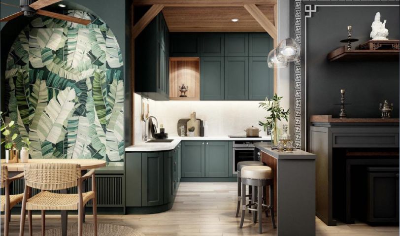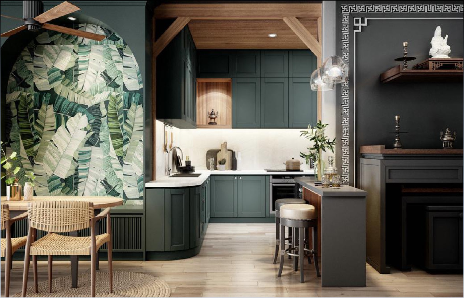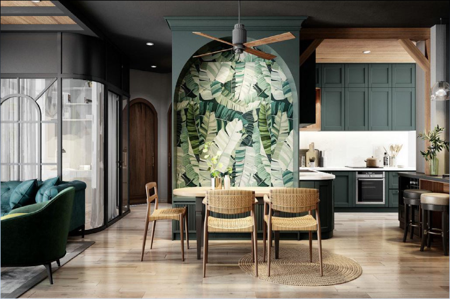 卡座與餐桌的結(jié)合,功能齊全,方便至極!在風(fēng)格上,這里延續(xù)客廳餐廳的裝飾,墨綠色的柜體搭配原木色的餐桌餐椅,木色地板極富質(zhì)感也有著天然的紋理,餐桌上方的吊扇燈飾更為這一空間增添了時(shí)尚感,整個(gè)空間毫不繁瑣,卻自有簡(jiǎn)潔特有的美感。