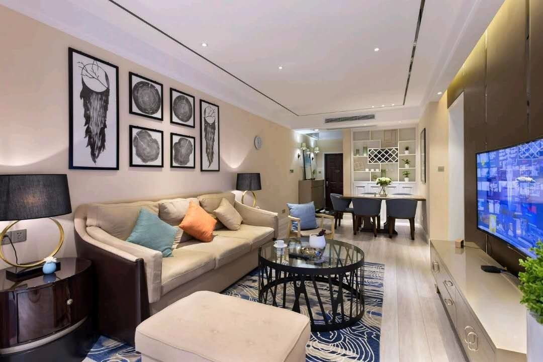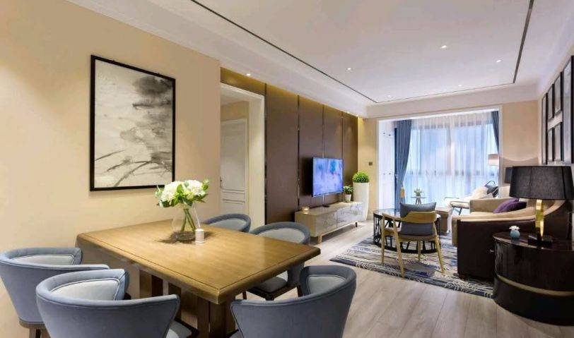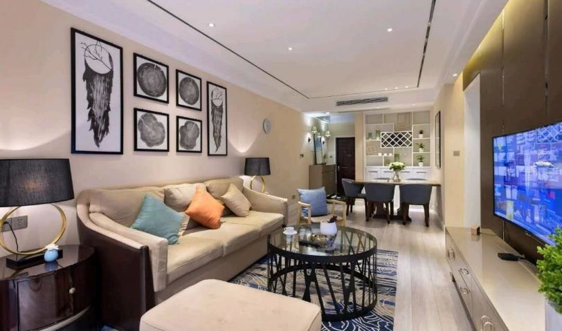 電視背景墻采用深色壁紙飾面,及大方又有氣派,結(jié)合軟裝的顏色,讓空間感,視覺感更強。