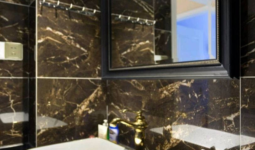 衛(wèi)生間采用防滑磚,干濕分離。深色大理石紋理的磚,讓衛(wèi)生間視覺感十足