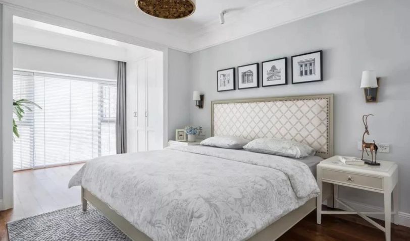 主臥選用淡灰色墻面,色調清淺自然,木質地板的溫潤與清新提