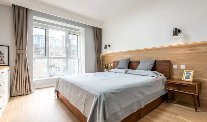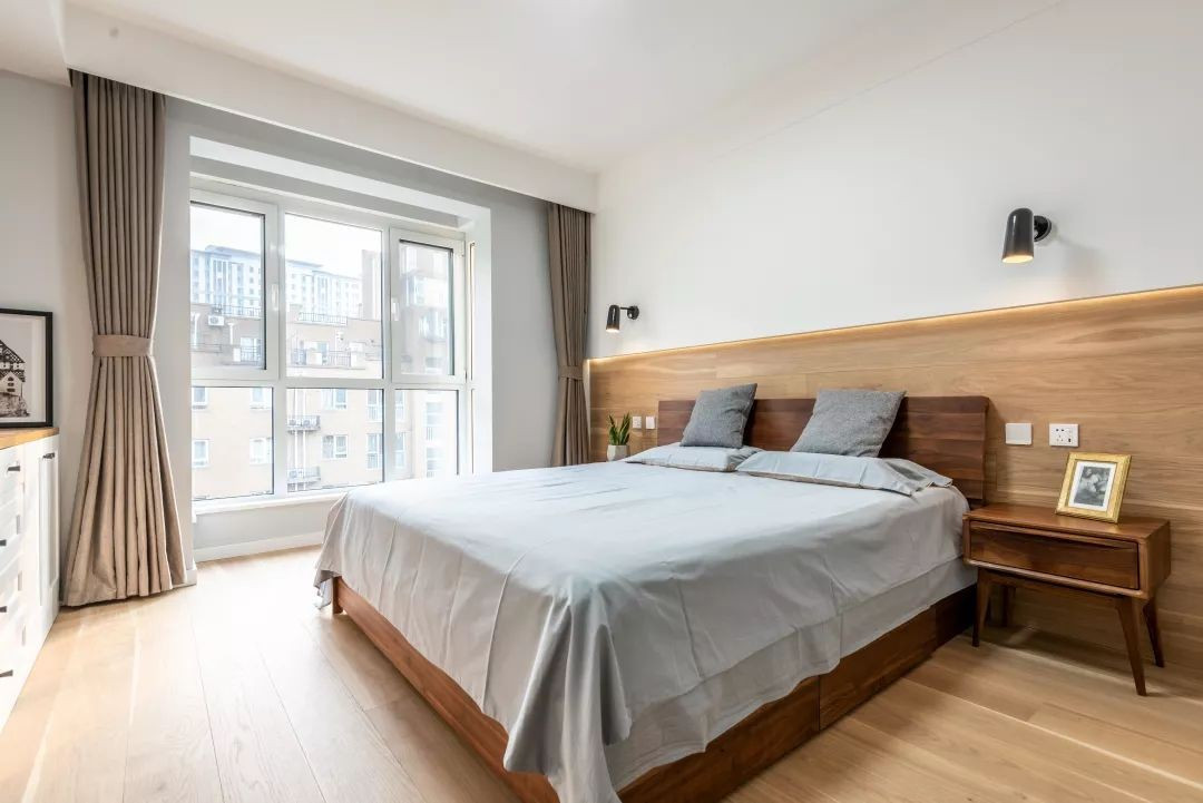 主臥床頭以木質為背景,搭配顏色稍深的胡桃木床與床頭柜,層次豐富有質感。
