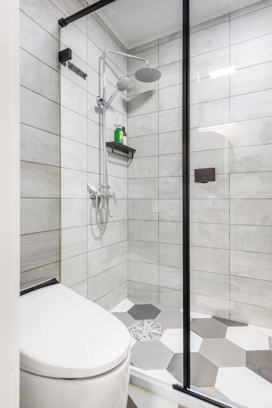 淋浴區墻面鋪設復古調的灰色磚,讓空間帶有一絲絲的懷舊氣息。