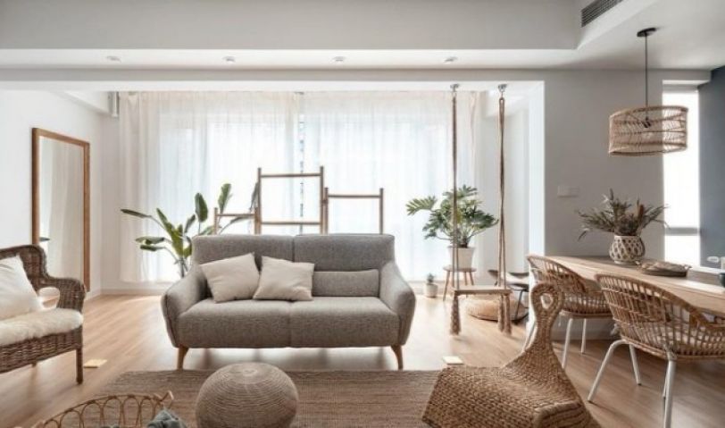 將原結構中的電視墻轉了90度,并把走廊融進客廳區域里