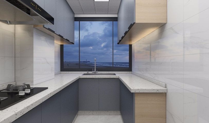 灰藍色的門板讓廚房變得更清爽