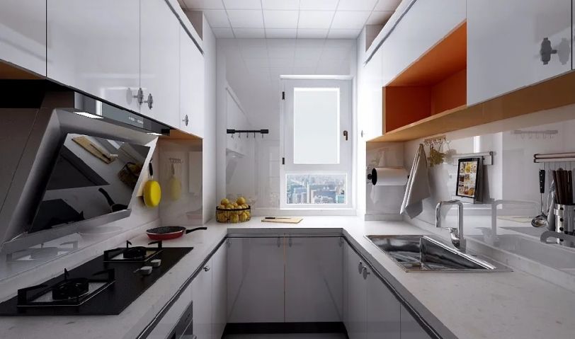 調整后的廚房可以滿足U型的櫥柜設計,在功能和動線上都得到了優化,使用方便,整體的色調以白色明亮為主。