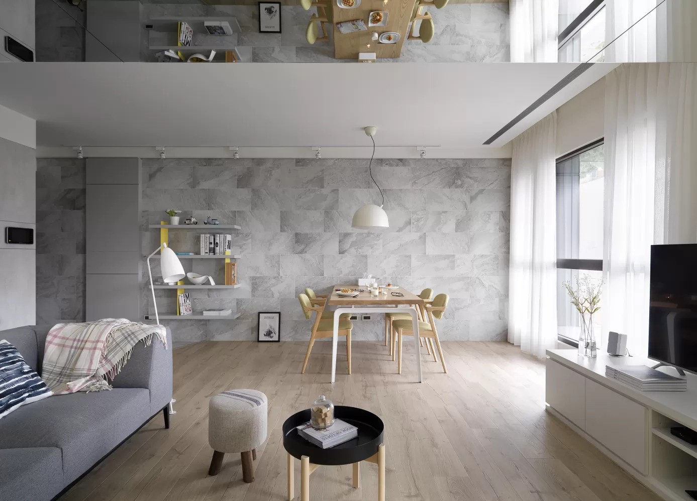 連貫的材質規劃貫通這個空間中心,墨色紋理巖板電視背景墻作為主視覺延伸