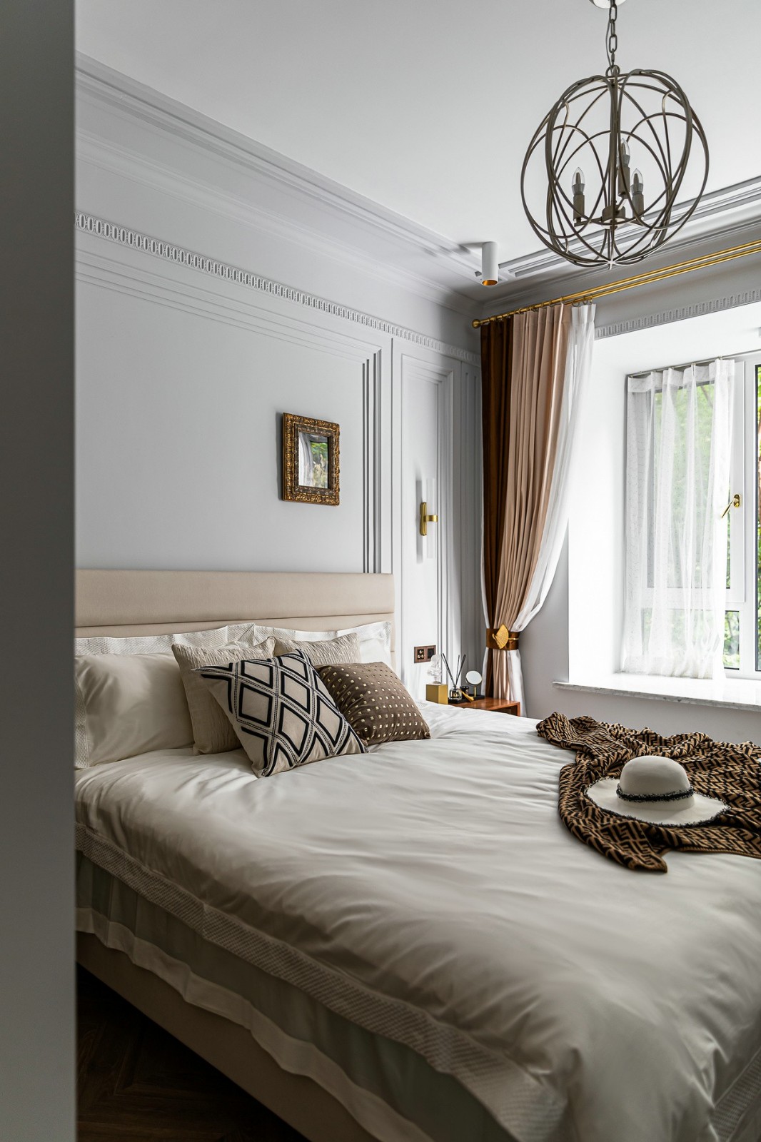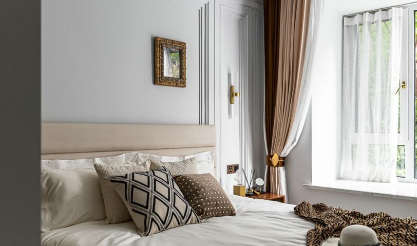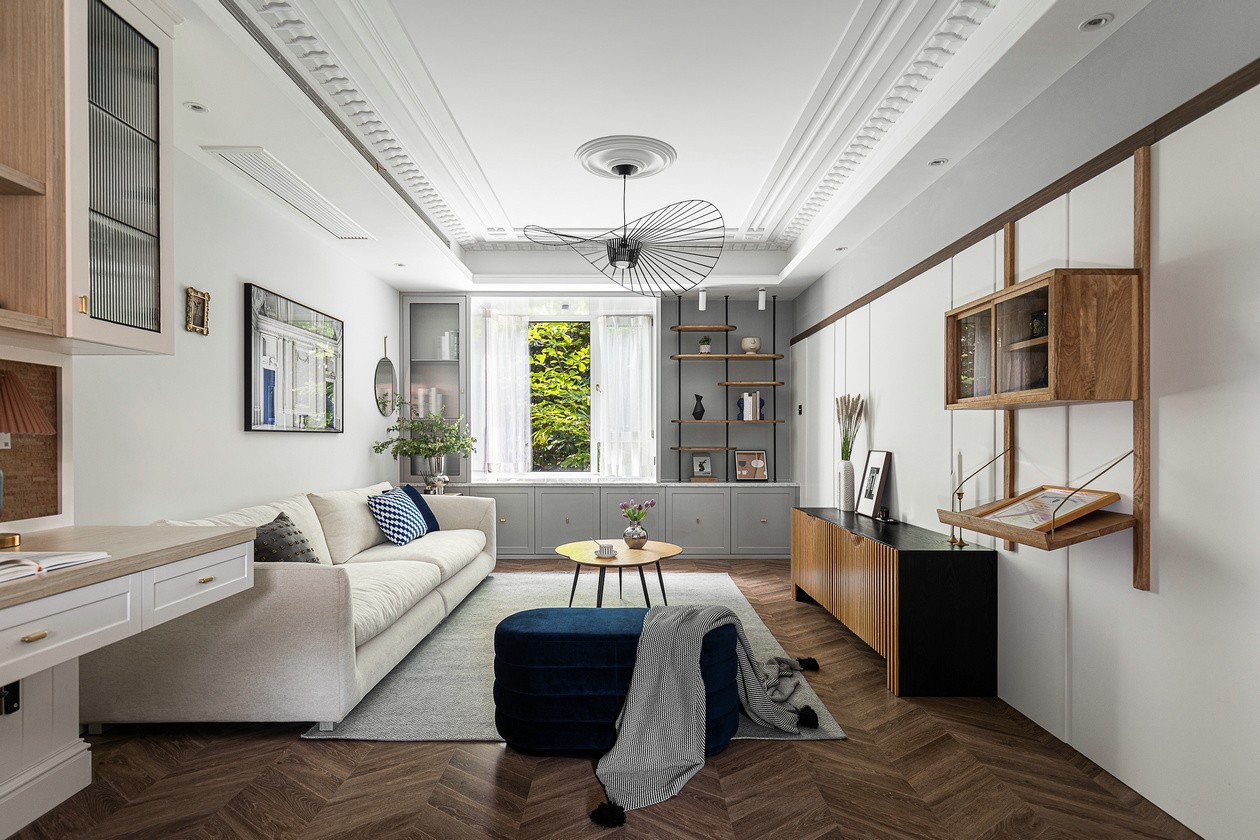 淺灰色的統籌之下,點綴了金色、棕色與黑色,搭配胡桃色地板,寧靜優雅的空間氛圍呼之欲出