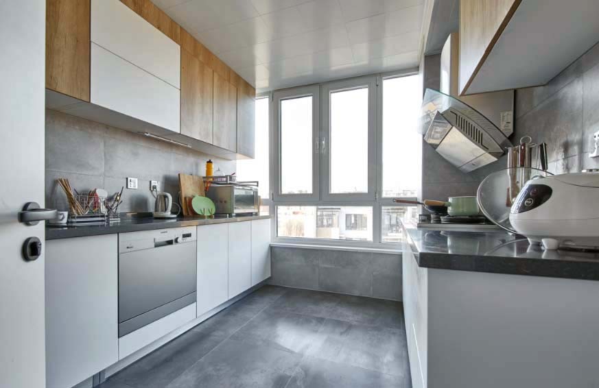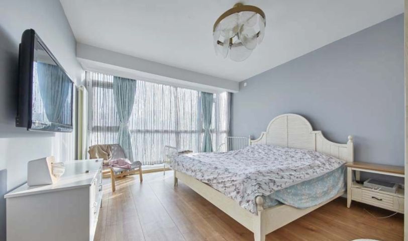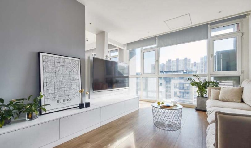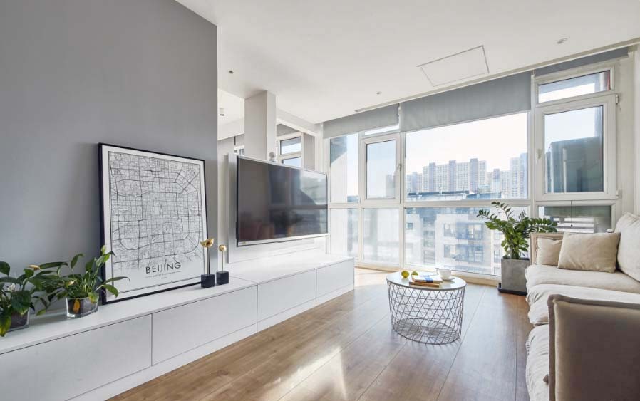 整個陽臺一側(cè)全部打通,客廳被移出來,光線被限度的引入室內(nèi),動線更加合理舒服。