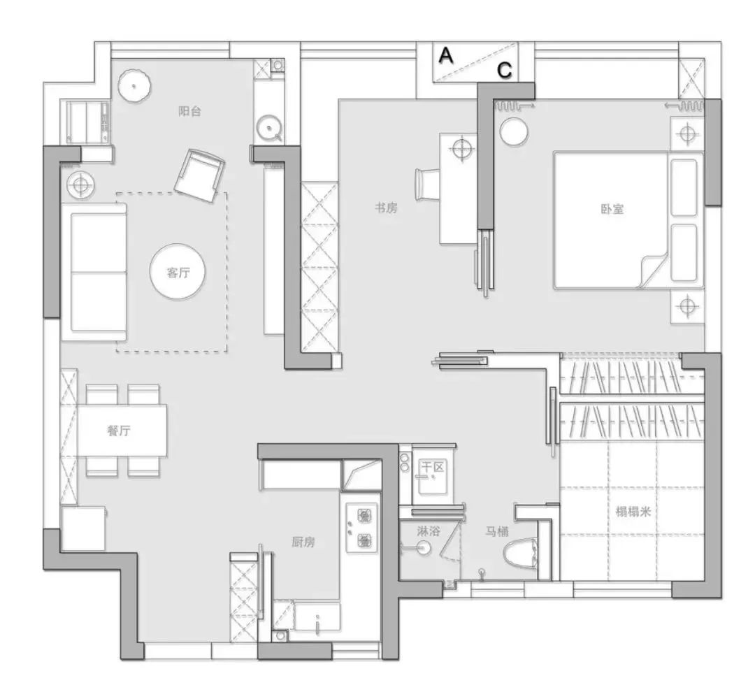 2、打通主臥和書房,分別配置移門,形成套間功能;