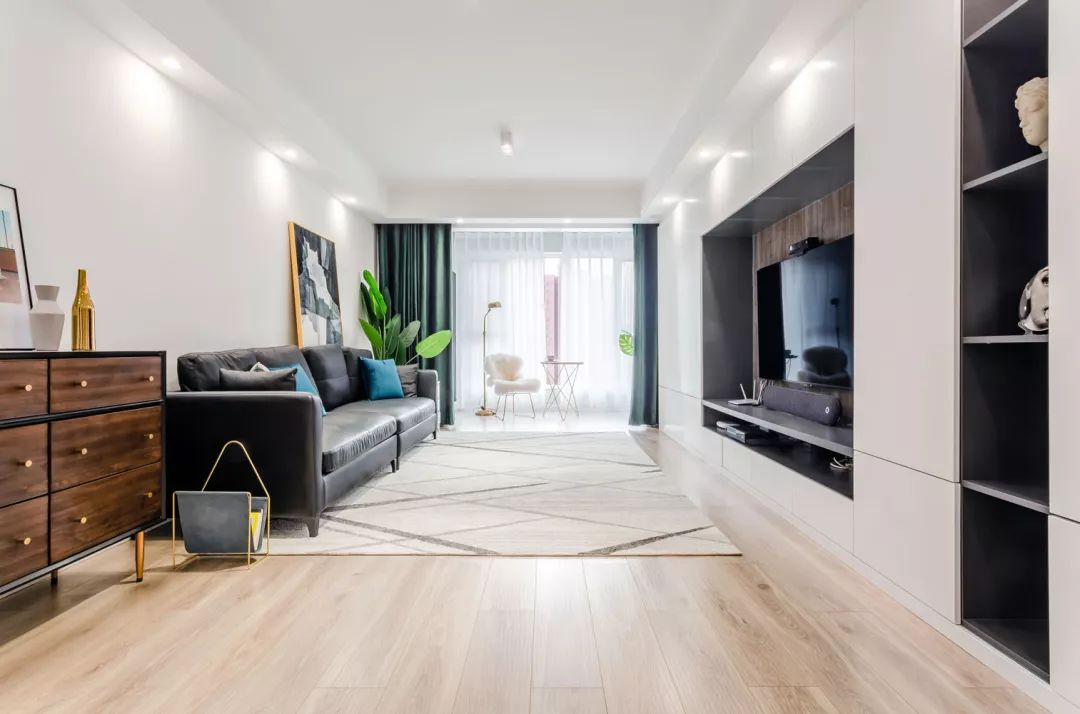 走過玄關走廊之后就到了客廳空間,客廳的電視背景墻被設計師改成了收納款式的,圍繞著電視做了滿墻的柜子。舍棄了茶幾之后,客廳看起來也寬敞不少。