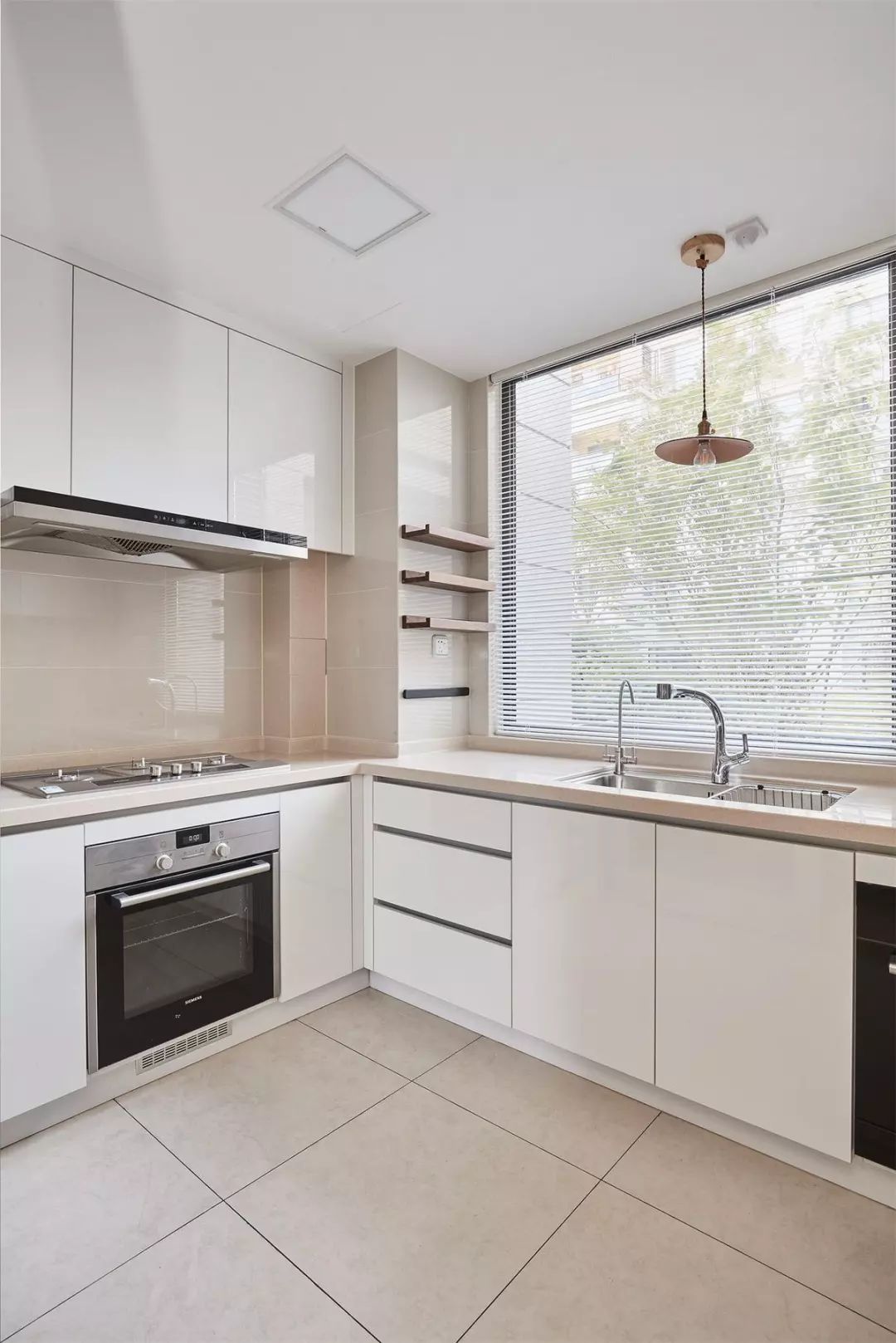 廚房內部光線比較好,而且屋主還選擇了白色的櫥柜門,搭配米色的墻地磚、臺面,整個廚房給人一種溫馨、簡潔的感覺。