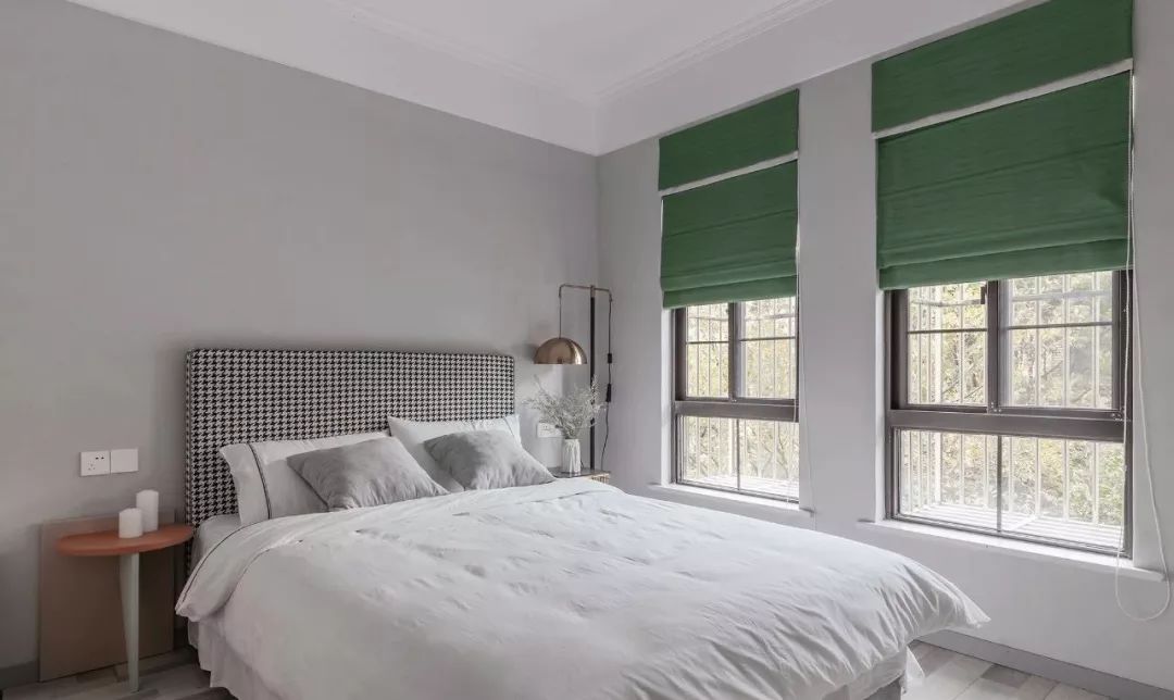 次臥設(shè)計會更為素雅一些,整體以灰色為主,搭配白色的床品和綠色的窗簾,在角落里放著一個別致的落地燈,更是創(chuàng)意時尚